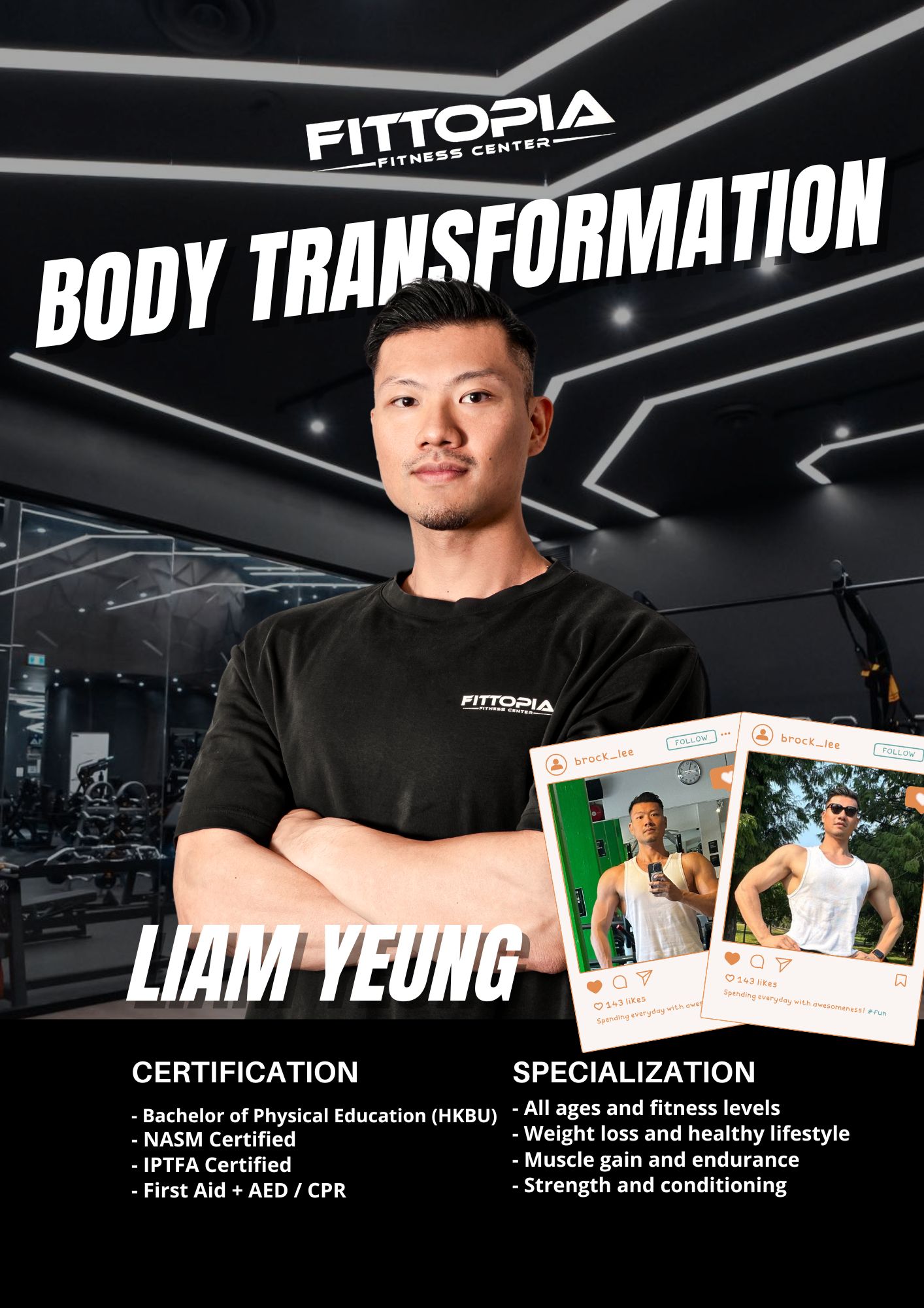 Liam is a highly experienced personal trainer with over 10 years of expertise in the field. He is passionate about sports and practiced track and field during his studies. After earning his Bachelor's degree in Physical Education from Hong Kong Baptist University in 2012, he started his career as a Personal Trainer. Liam holds certifications from NASM (National Academy of Sports Medicine) and IPTFA (International Personal Trainers and Fitness Academy). He possesses a comprehensive understanding of sports performance, injury prevention, and effective training methods, and is experienced in working with clients of all fitness levels - from beginners to competitive athletes - tailoring programs to meet each individual's unique goals and needs.